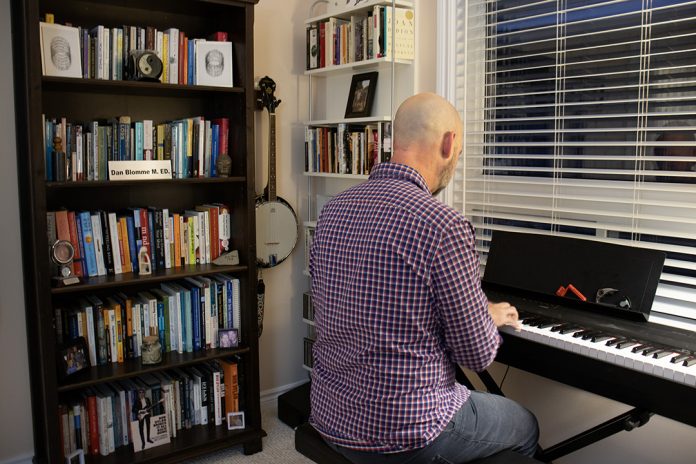 Daniel Blomme records music for his 2022 album, "Suspension" in the studio, with his wife Jen. She sang on two of the songs. Photo credit: Dan Blomme