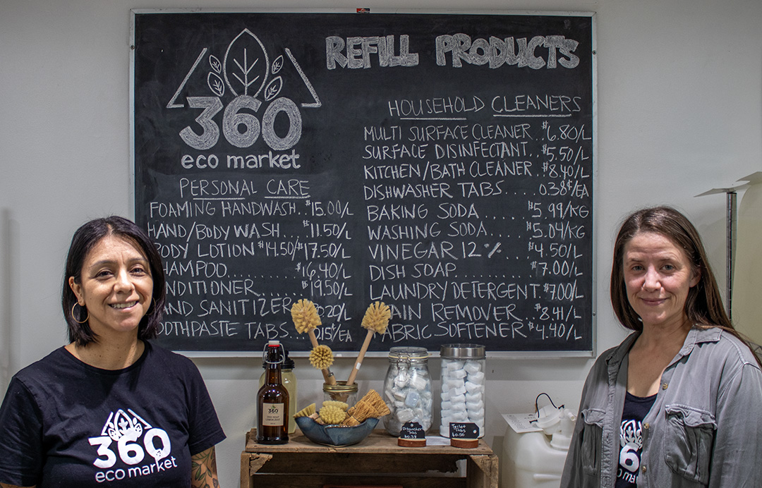 Co-owners Irania Ledesma and Brianne Blackman of 360 Eco Market are standing in front of their product display and price board in downtown Oshawa on Oct. 31.