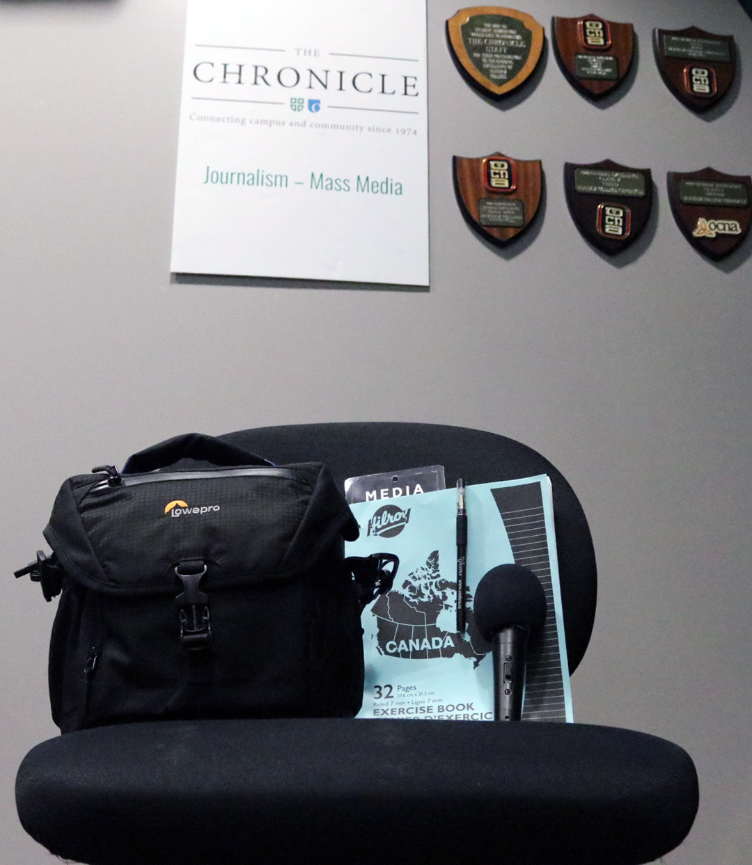 An empty chair with a press badge and notebook sits in a newsroom at Durham College on Feb. 11, 2025. The image symbolizes the dangers journalists face while reporting in conflict zones, such as the recent casualties in Gaza. Photo by Bryson Betts – The Chronicle.