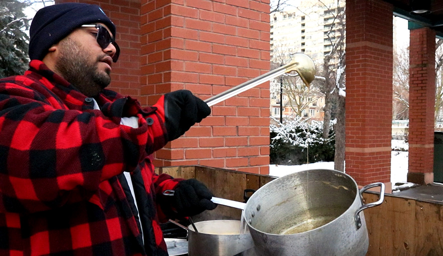 Sumit Raghav checks the consistency of their new batch of syrup when preparing to make maple taffy candies on Jan.11 2025 to distribute at Pickering City Hall for Pickering’s 25th aniversairy.