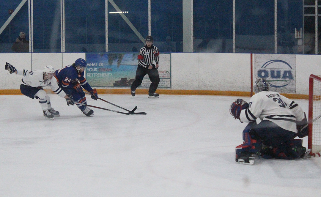 Ontario Tech Ridgebacks forward Cullen McLean drives the puck towards the net against University of Toronto goaltender Jordan Farlie at the Campus Ice Centre in Oshawa Ont. Reese Davidson