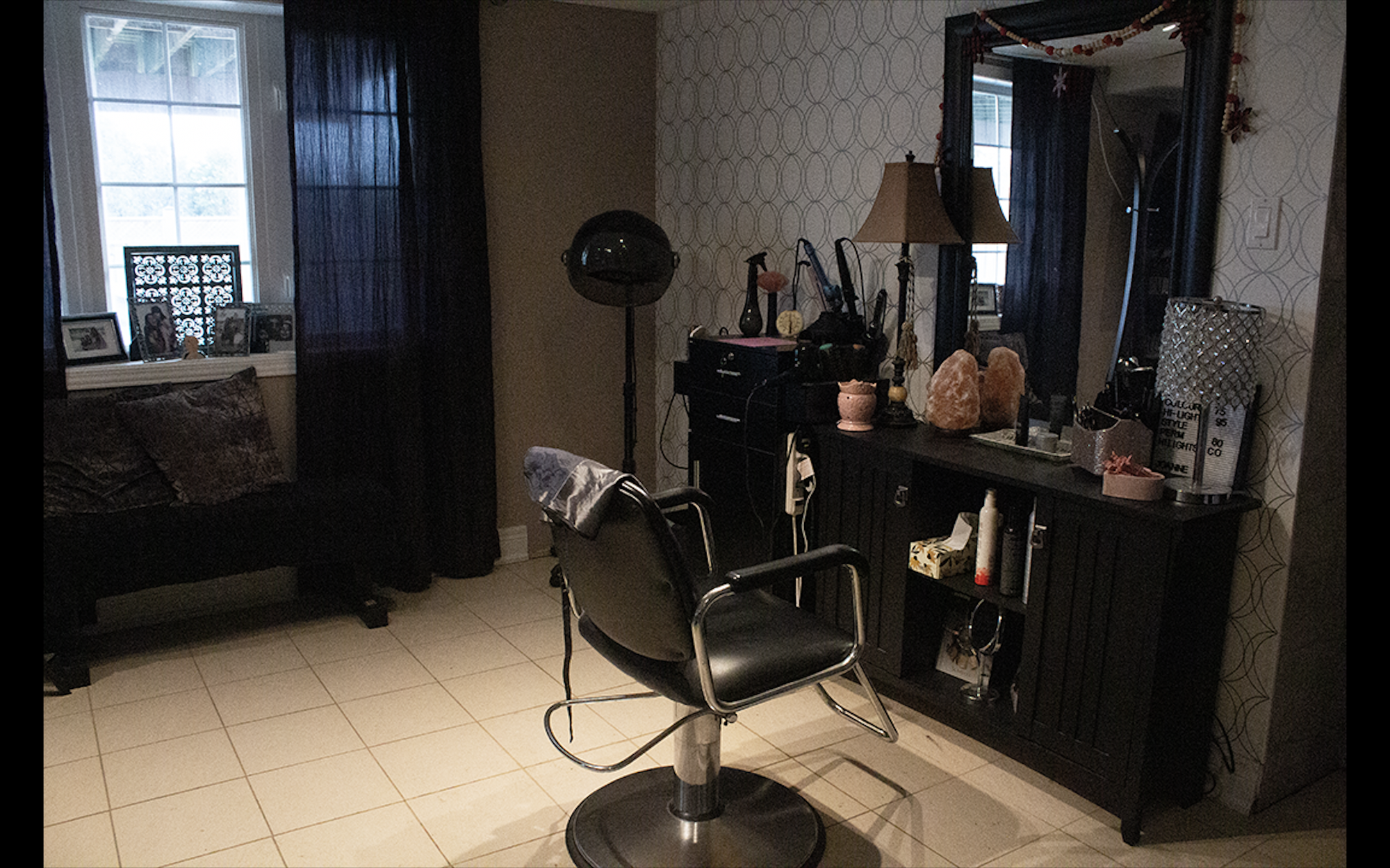 Nov. 22. 2024. Joanne Lorefice’s hair salon at her home in Whitby, Ont. She is able to spend more time with her family now that she works from home. Photo by Isabella Conforti.