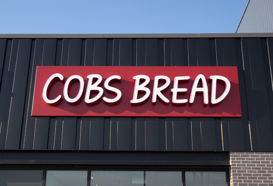 The Cob’s Bread Brooklin signage. The background is red and the text is white.